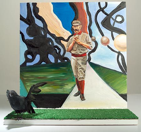 Mordecai Centennial Brown lost two fingers on his right hand in a farm-machinery accident, later gaining him the name "Three Finger Brown." Overcoming this handicap and turning it to his advantage, he became one of the elite pitchers of his era. This painting shows a pair of severed fingers in a pool of blood.