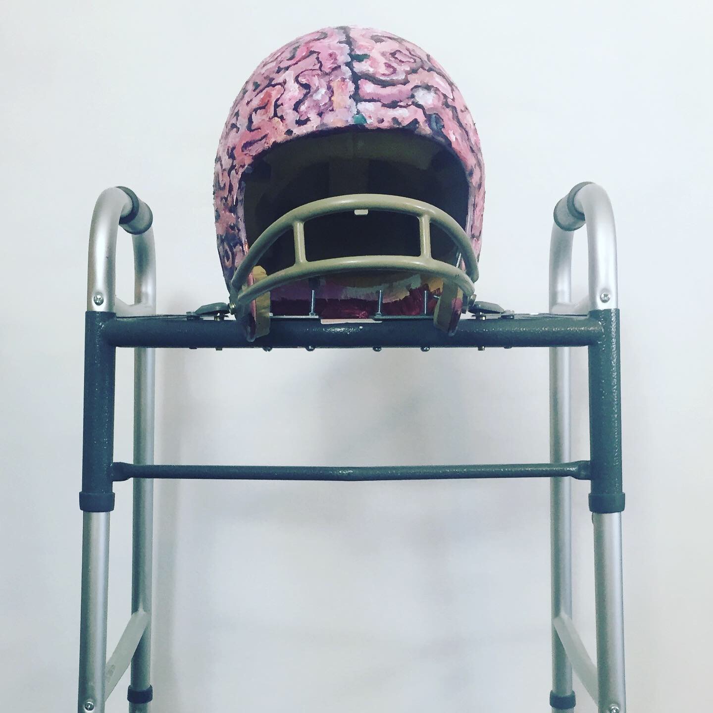 Tough guys don’t get hurt. Oil on helmet attached to walker, 2019. $5,000